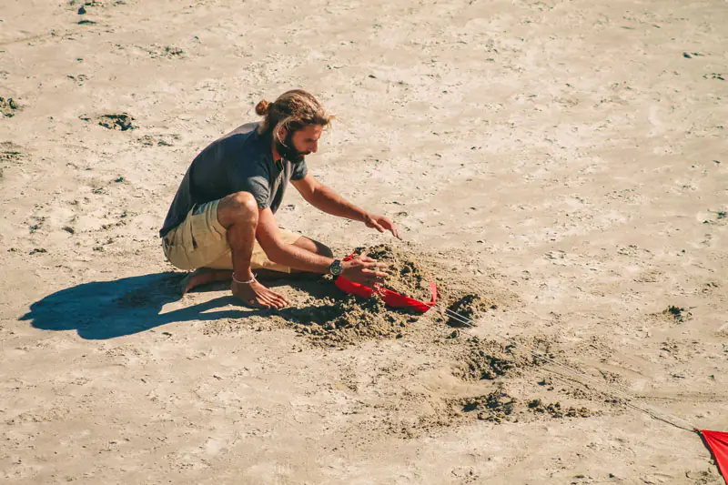 Spread the Hut, ropes and sand anchors flat on the sand in a ‘X’ shape
