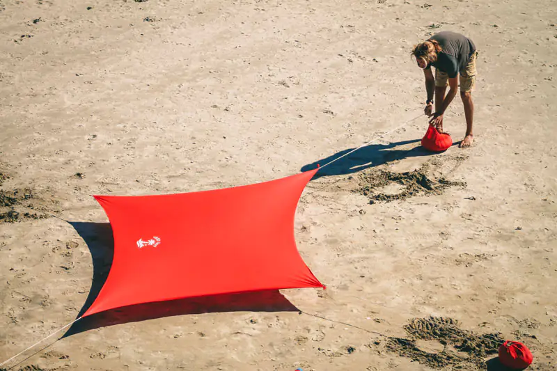- Before you pop up the Hut make sure the fabric is stretched in the X shape. You may have to relocate the sand anchors until you get a perfectly stretched X shape. The fabric is meant to stretch, you want it tight, but not crazy tight!